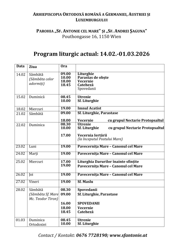 Pentru sfințirea caselor de Bobotează la începutul anului 2026, enoriașii Parohiei Sf. Antonie din Viena sunt rugați să se anunțe cu cel puțin 2 zile înaintea zilei trecute în programul de mai jos.