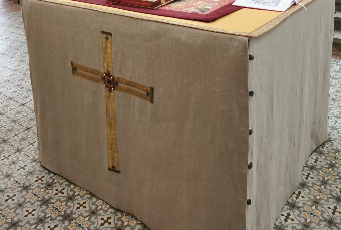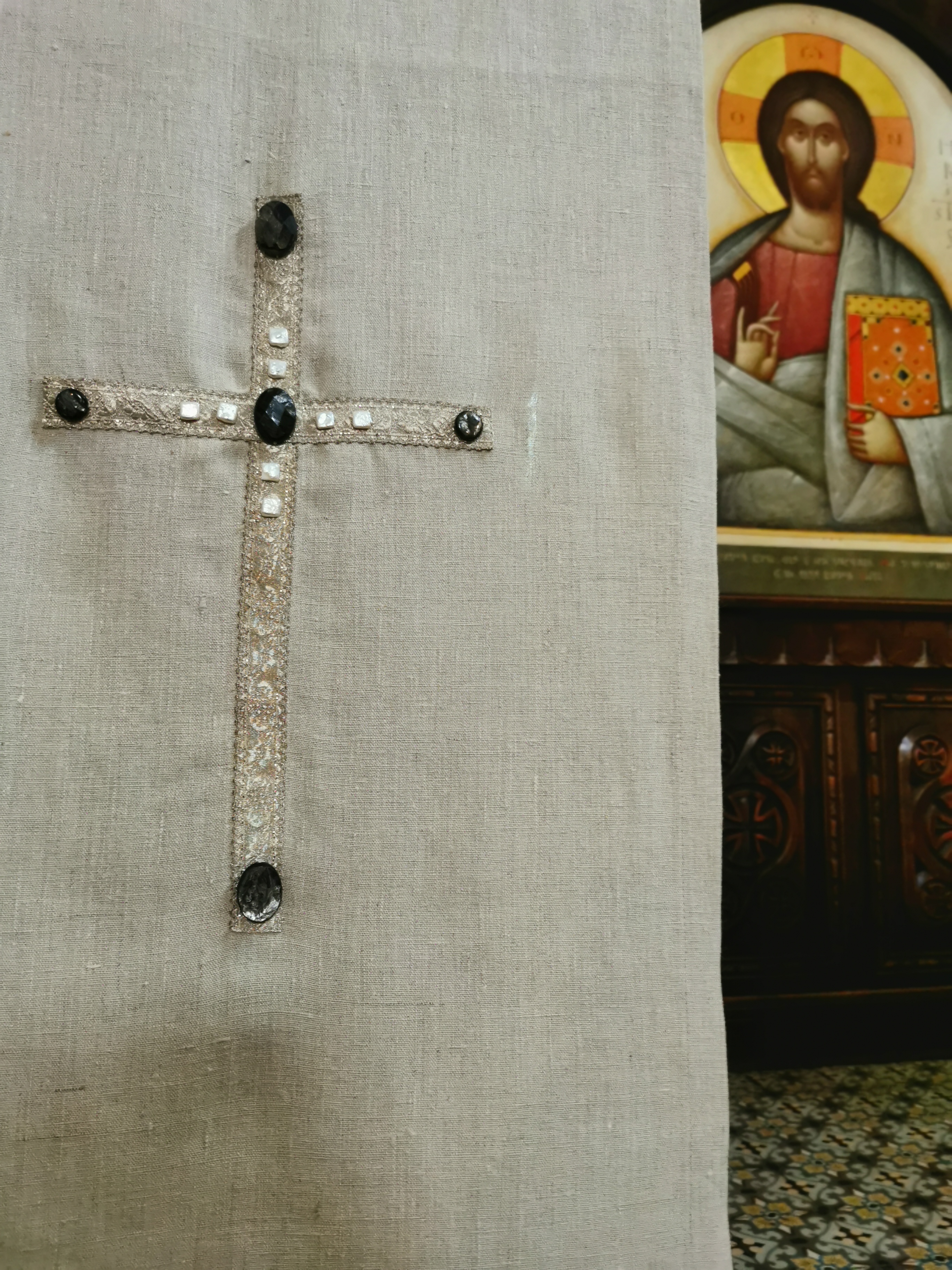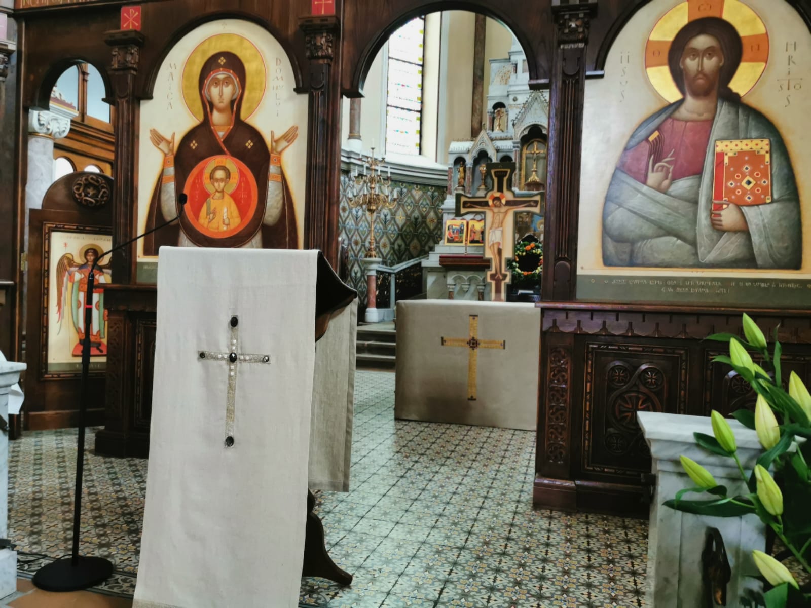 Multumim dnei Ana Plaidl si dnei preotese Patricia pentru noile creații realizate în cadrul atelierului parohial de croitorie bisericească: vestminte pentru Sf. Masă, dvere și acoperăminte pt. Sf. Altar – din material de cânepă, galoane vechi recuperate si pietre semiprețioase. Un dar deosebit pentru noaptea de Paști!