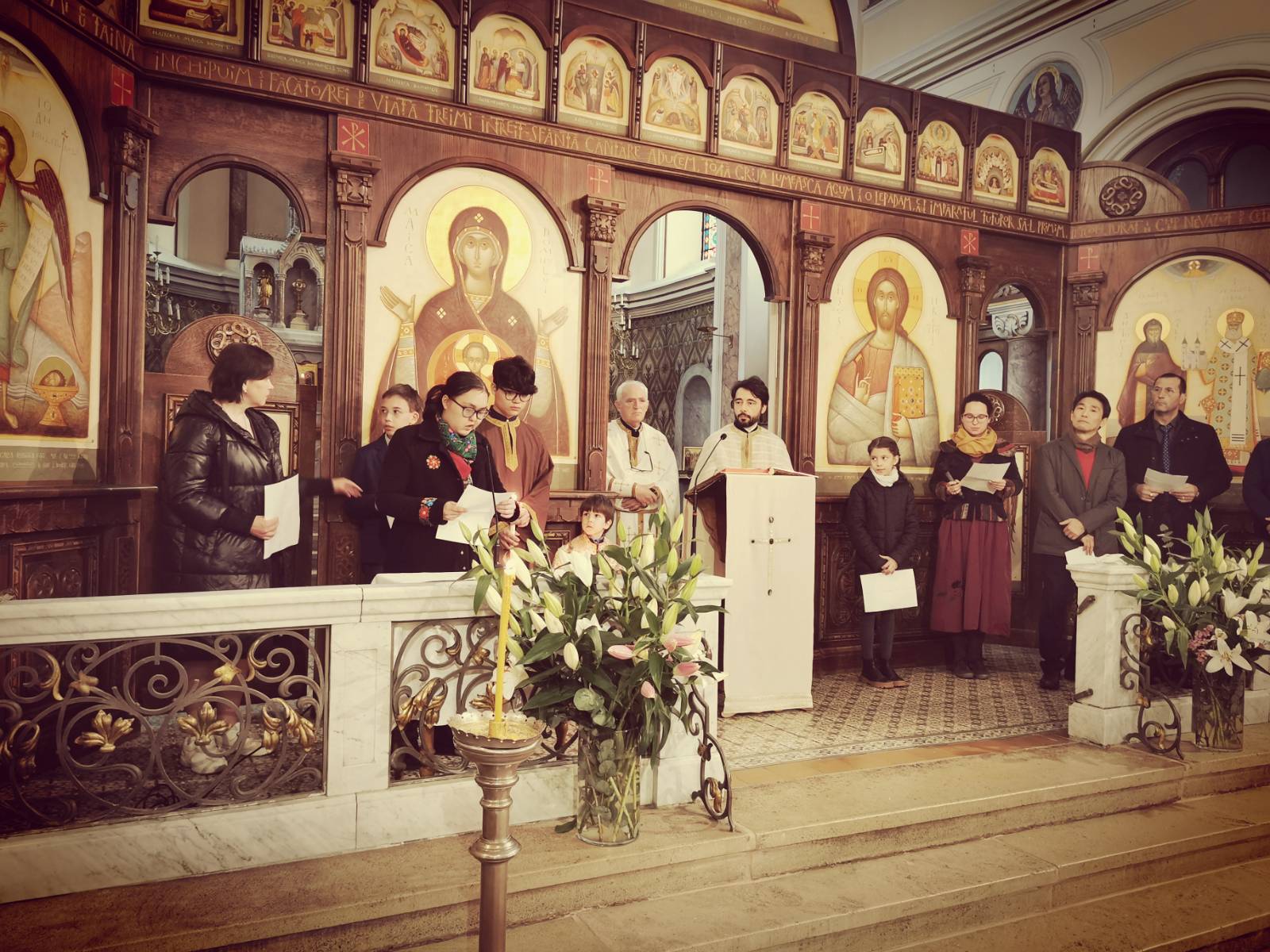 În Duminica Paștilor, la Vecernia Învierii, o biserică plină de credincioși a ascultat Evanghelia de la Ioan 20, 19-25 în 10 limbi, rostite de părinții slujitori și enoriași (majoritatea copii și tineri) ai parohiei noastre: română, greacă veche, latină, germană, UCRAINIANĂ, engleză, franceză, japoneză, italiană, spaniolă.