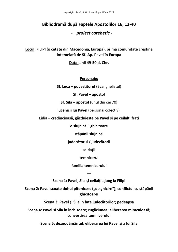 Astfel, cei participanți (grupa de vârstă 10-16 ani) au descoperit un text mai puțin cunoscut din Faptele Apostolilor: capitolul 16 (Sf. Ap. Pavel și Sila în Filipi). Scena propovăduirii pauline în prima cetate europeană (convertirea Lidiei, conflictul cu stăpânii slujnicei-ghicitoare, întemnițarea celor 2 apostoli, cutremurul nocturn, convertirea temnicerului etc.) au putut fi înțelese – urmând foarte fidel textul biblic – prin punere în scenă, prin dialog, prin mișcare și improvizație. Două grupe paralele au lucrat pline de entuziasm la acest proiect bibliodramatic, rezultatele fiind impresionante!