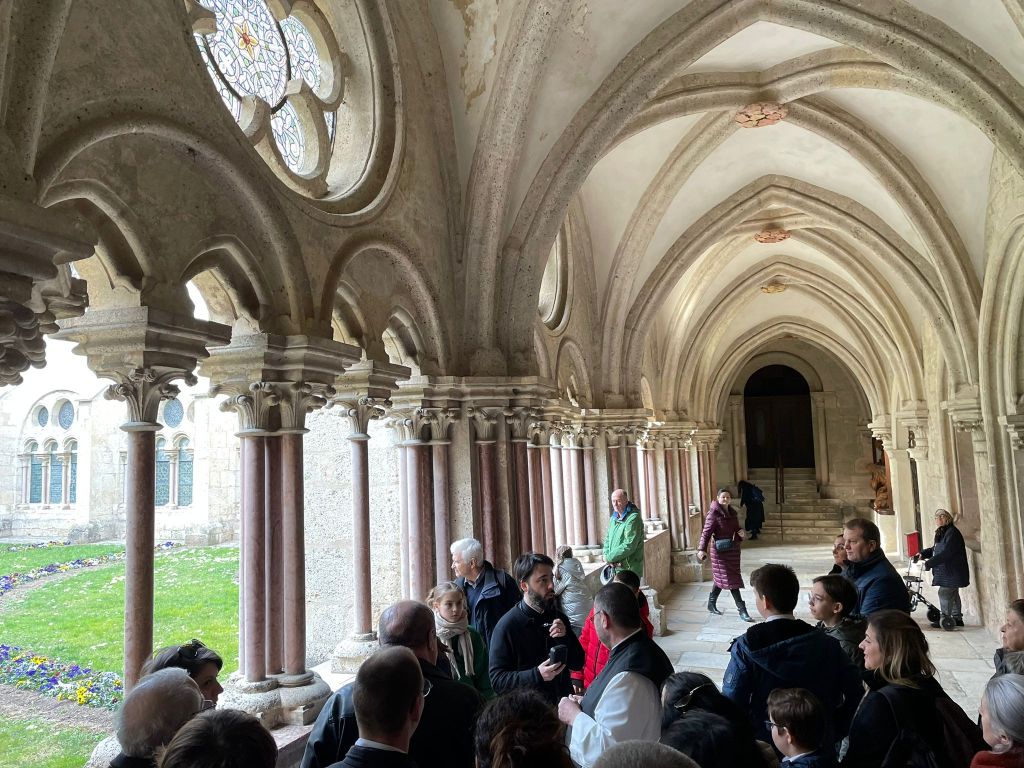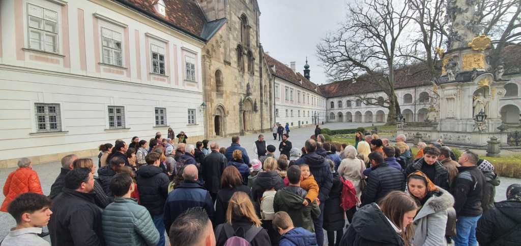 Programul a continuat, printr-un tur ghidat prin toată mănăstirea. Astfel, pelerinii vienezi au putut descoperi, în compania părintelui Stephan, frumusețile arhitecturale ale locului, istoria și profilul spiritual al cistercienilor, ritmul de rugăciune și de viață al călugărilor și a putut adânci, în dialog, teme de duhovnicie care leagă monahismul apusean de cel răsăritean. După ce o parte din credincioși au mers și pe drumul Crucii, grupul de pelerini a participat în număr mare la Vecernia în limba latină cântată în stil gregorian de călugării mănăstirii, în frunte cu abatele Maximilian Heim, în capela Bernardi. Călugării au fost impresionați de participarea numeroasă și atentă a pelerinilor români, iar pelerinii români ortodocși au descoperit alteritatea tradiției muzicale bisericești apusene.
