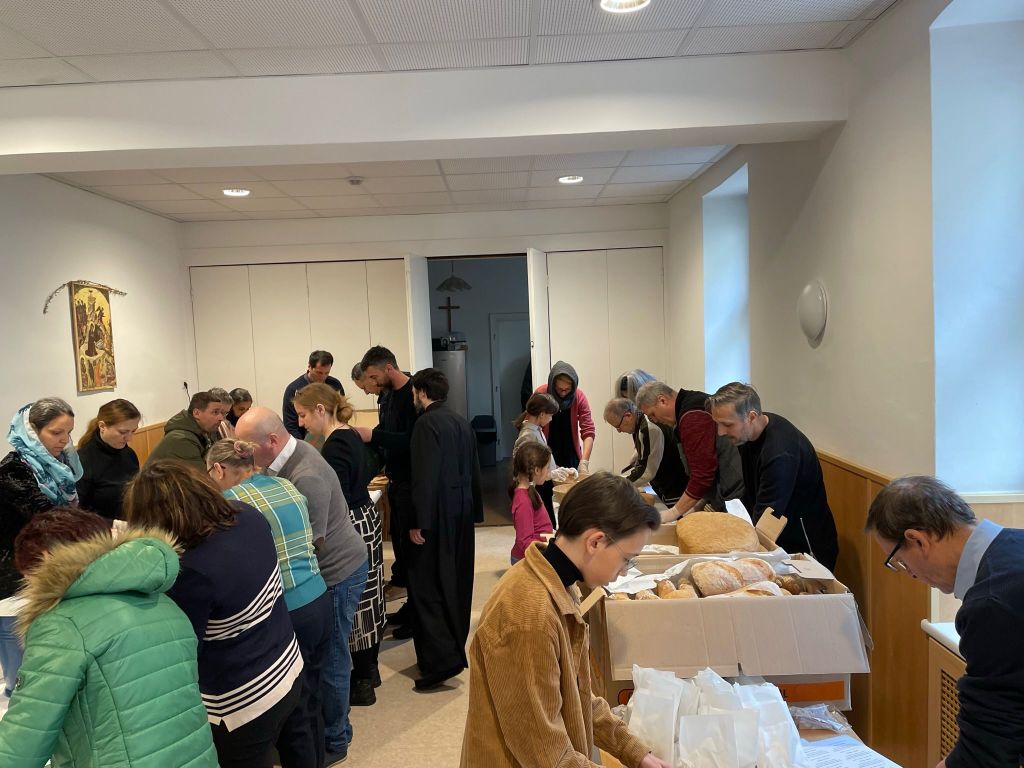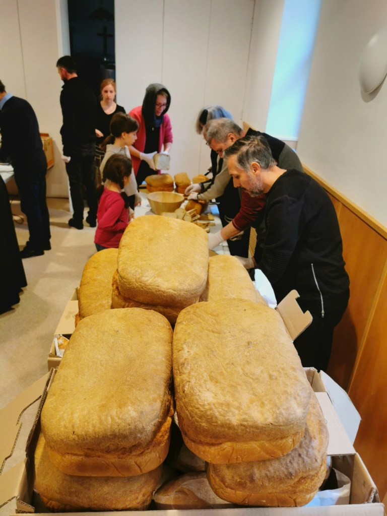 Sâmbătă, după Sf. Liturghie a Sf. Vasile cel Mare, peste 30 de enoriași au participat la pregătirea pâinii sfințite, stropite cu vin (numite „paști”).