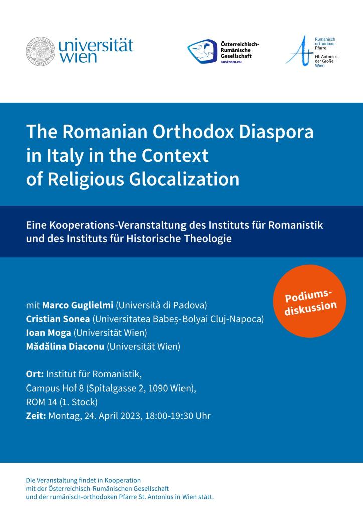 Mo 24. April, 18 h | Podiumsdiskussion: The Romanian Orthodox Diaspora in Italy in the Context of Religious Glocalization Detalii: https://austrom.eu/2023/04/11/mo-24-april-18-h-podiumsdiskussion-the-romanian-orthodox-diaspora-in-italy-in-the-context-of-religious-glocalization/?utm_source=mailpoet&utm_medium=email&utm_campaign=Mo+24.+April%2C+18+h+%7C+Podiumsdiskussion+zur+orthodoxen+Diaspora Evenimentul are loc în format hybrid. Pt. a găsi modul de accesare prin platforma zoom, apăsați link-ul de sus! Teilen mit: Dă clic pentru a partaja pe Facebook(Se deschide într-o fereastră nouă) Facebook Dă clic pentru partajare pe WhatsApp(Se deschide într-o fereastră nouă) WhatsApp Dă clic pentru a imprima(Se deschide într-o fereastră nouă) Imprimare Dă clic pentru a trimite o legătură prin email unui prieten(Se deschide într-o fereastră nouă) Email Dă clic pentru a partaja pe X(Se deschide într-o fereastră nouă) X