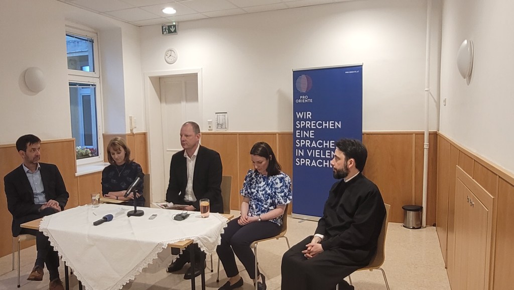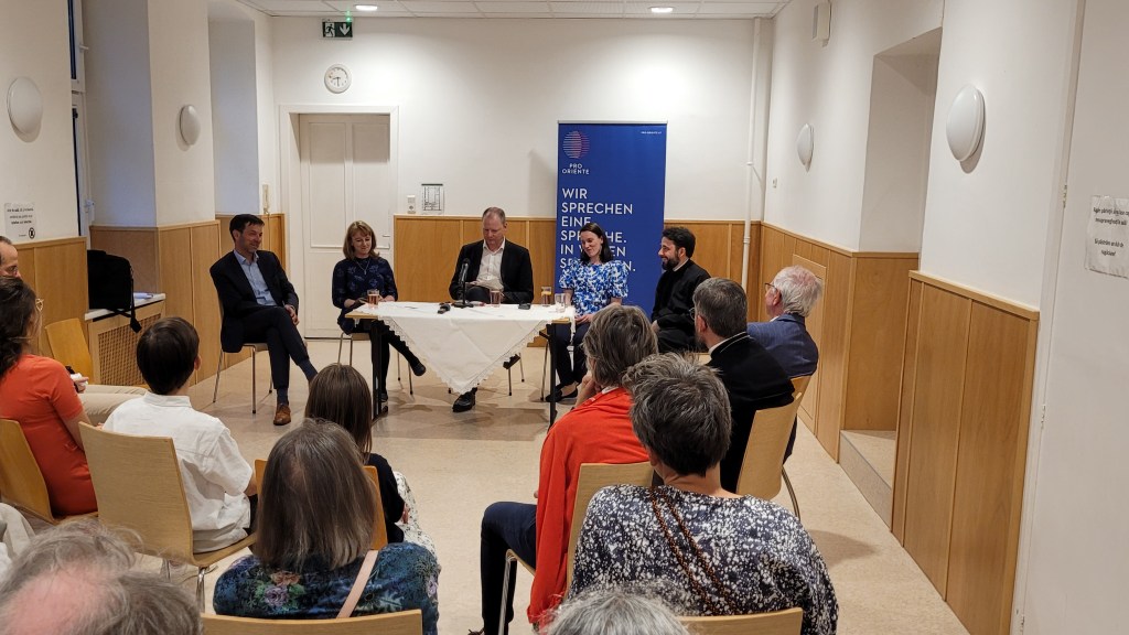 De la ora 20.00, timp de o oră jumătate, redactorul-șef al agenției de presă catolică Kathpress, dl. Georg Pulling a moderat un dialog la care au luat parte, alături de Bernd Mussinghof (secretar general al Fundației Pro Oriente), pr. prof. Ioan Moga, precum și două tinere: Maria Piciu (juristă, coordonatoare a activităților cu tineret din Parohia Sf. Antonie) și Christina Dietl (asistent universitar în teologie liturgică, cu multă experiență și expertiză academică în relația cu tradiția ortodoxă). Cele două tinere au accentuat importanța relațiilor personale, de prietenie, pentru cunoașterea celeilalte tradiții și au relatat momente biografice care evidențiază acest lucru. Mussinghoff a vorbit, printre altele, despre experiențele pozitive pe care Fundația Pro Oriente le-a avut până acum cu atelierele sale pentru tineri din Orientul Mijlociu. În cadrul acestor ateliere, tinerii din diferite biserici și țări preucum Israel, Libanon, Siria etc. sunt însoțiți și susținuți în dobândirea mai multor cunoștințe despre alte biserici creștine. Pr. Moga a considerat că aprofundarea spiritualității este o bună rețetă de apropiere reciprocă. Cu cât oamenii se apropie mai mult de Iisus Hristos ca centru al credinței, cu atât ei se vor apropia mai mult și unii de alții, a fost convins preotul.