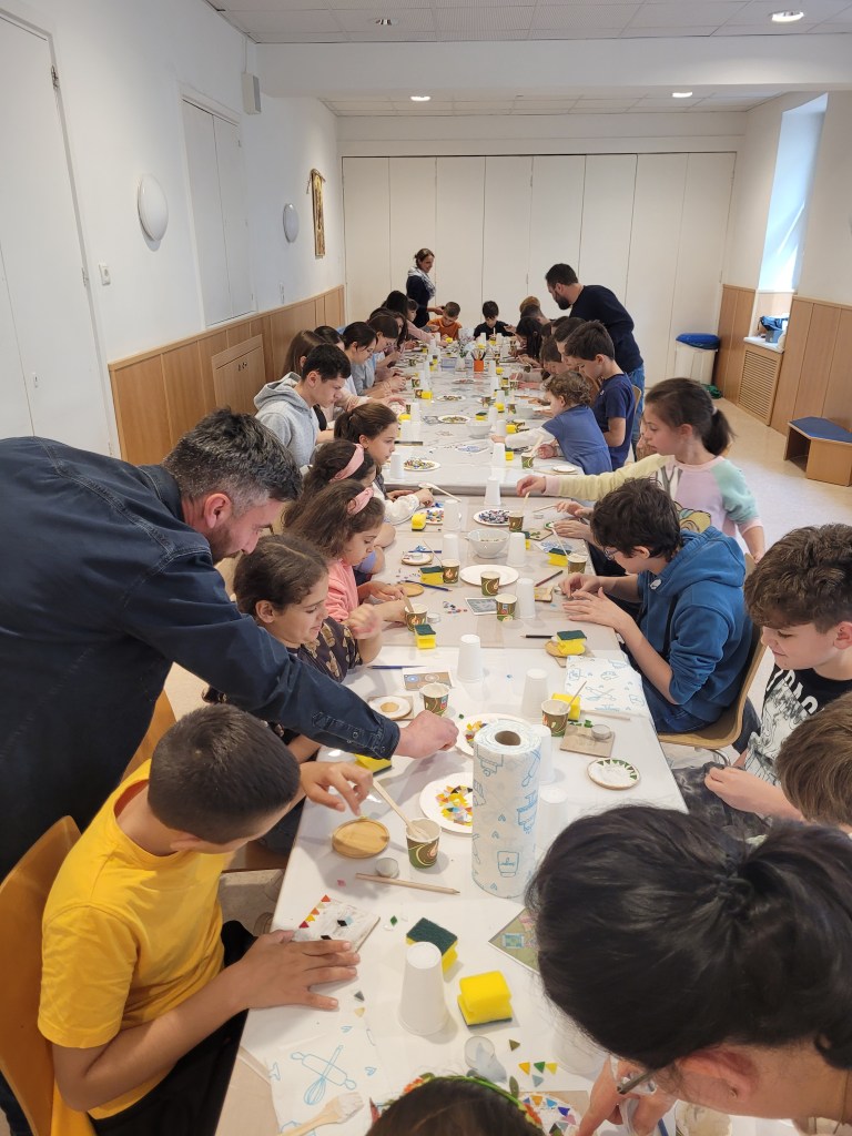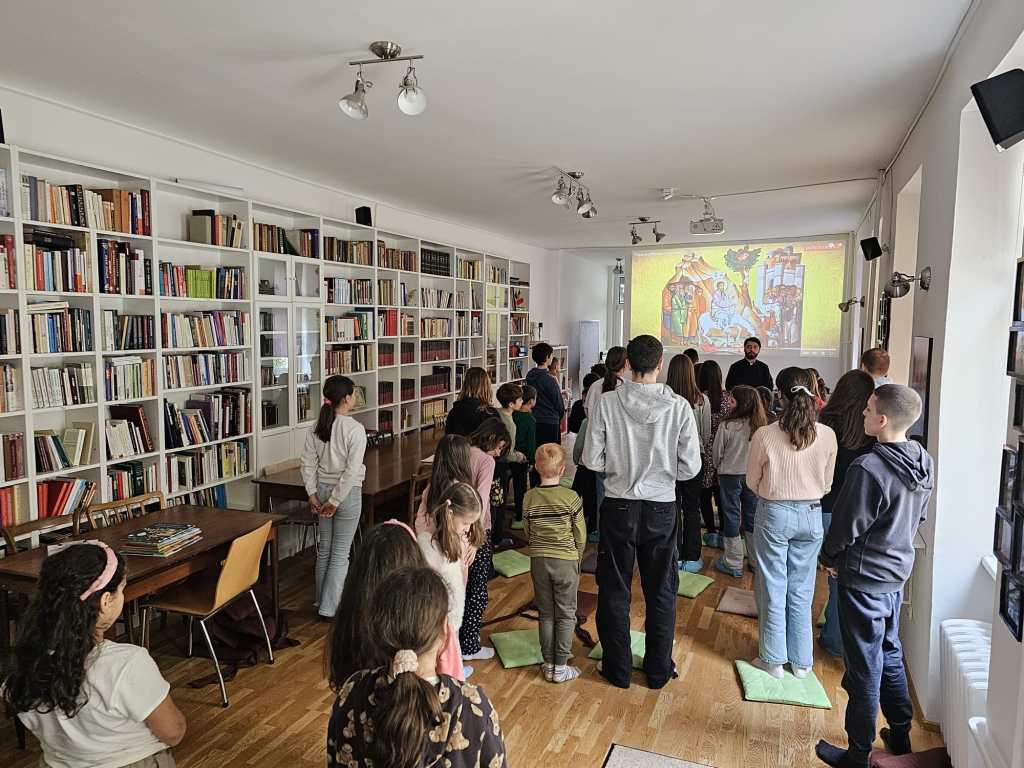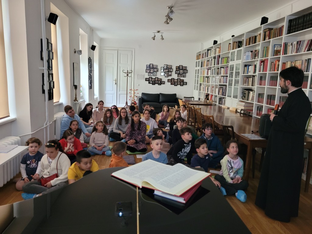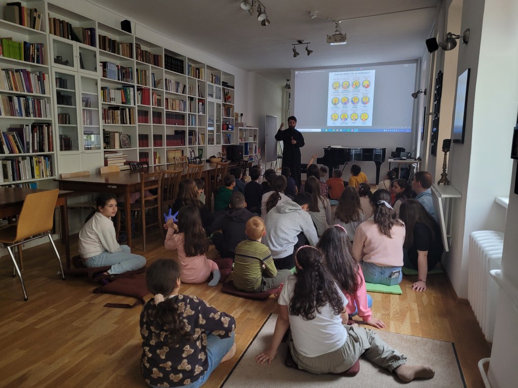 Ulterior, cei peste 35 de participanți au avut o întâlnire de dialog catehetic cu pr. Ioan. Temele au fost: cei 12 apostoli, Floriile și Răstignirea Domnului, invidia ca una din principalele surse ale răului între oameni, Taina Spovedaniei. Copiii au învățat să cânte troparul Floriilor și au continuat proiectul învățării rugăciunii Tatăl nostru în mai multe limbi străine.