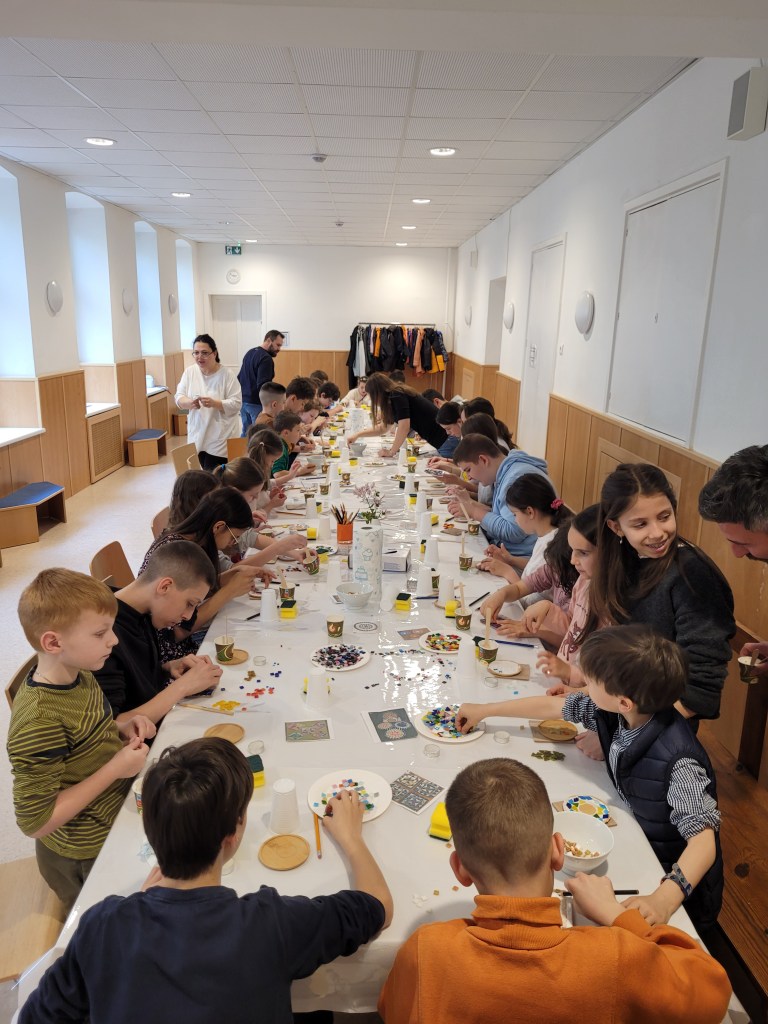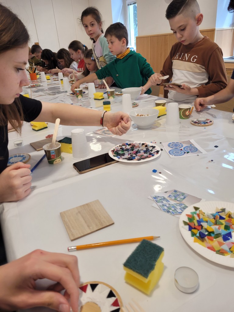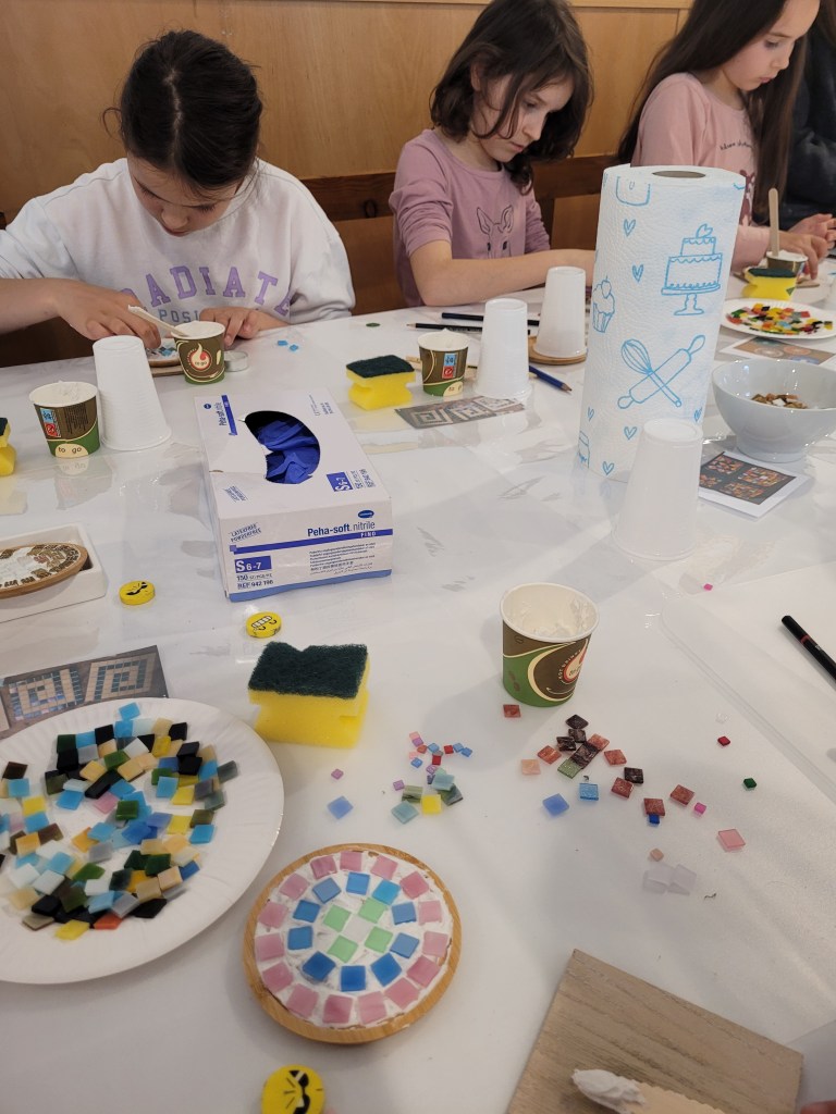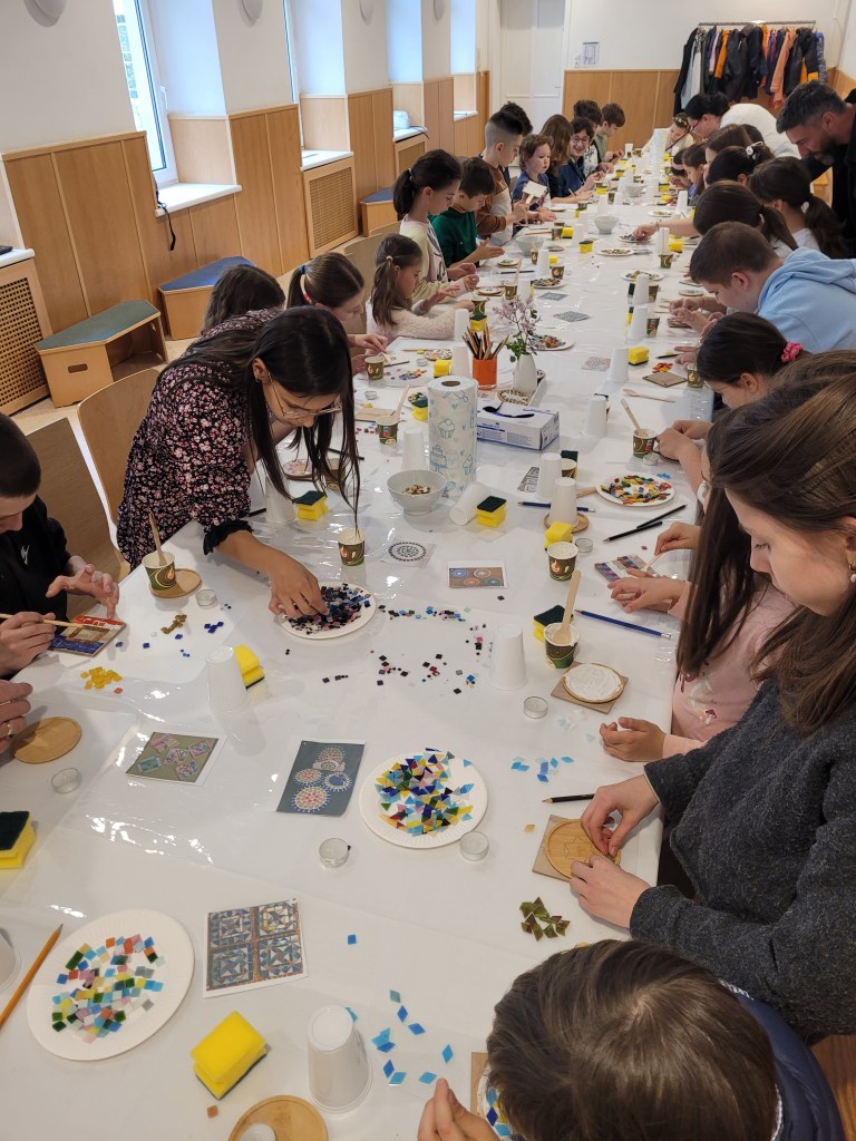 Sâmbătă, 20 aprilie, copiii de la Școala Parohială a Parohiei Sf. Antonie din Viena au avut parte de un program inedit. Alături de Dana și Ilie Orelețchi, ei au descoperit arta mozaicului, au făcut cunoștință cu capodopere de artă creștină lucrate în mozaic (prin intermediul albumelor de artă) și au reușit să meșterească, cu multă migală, suporturi de candelă sau de lumânare în tehnică de mozaic, pentru părinții și bunicii lor.
