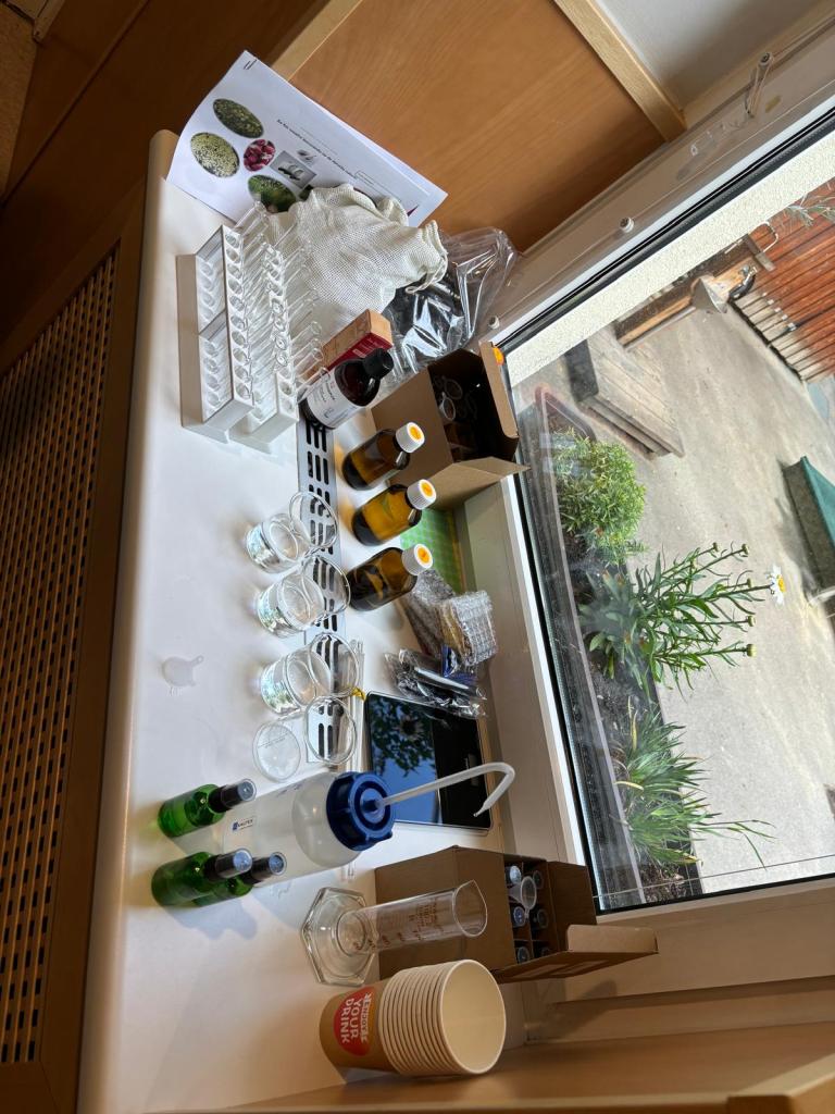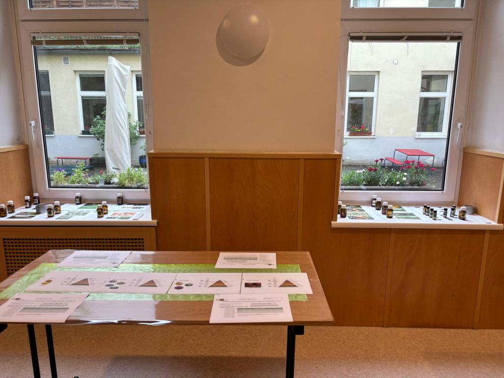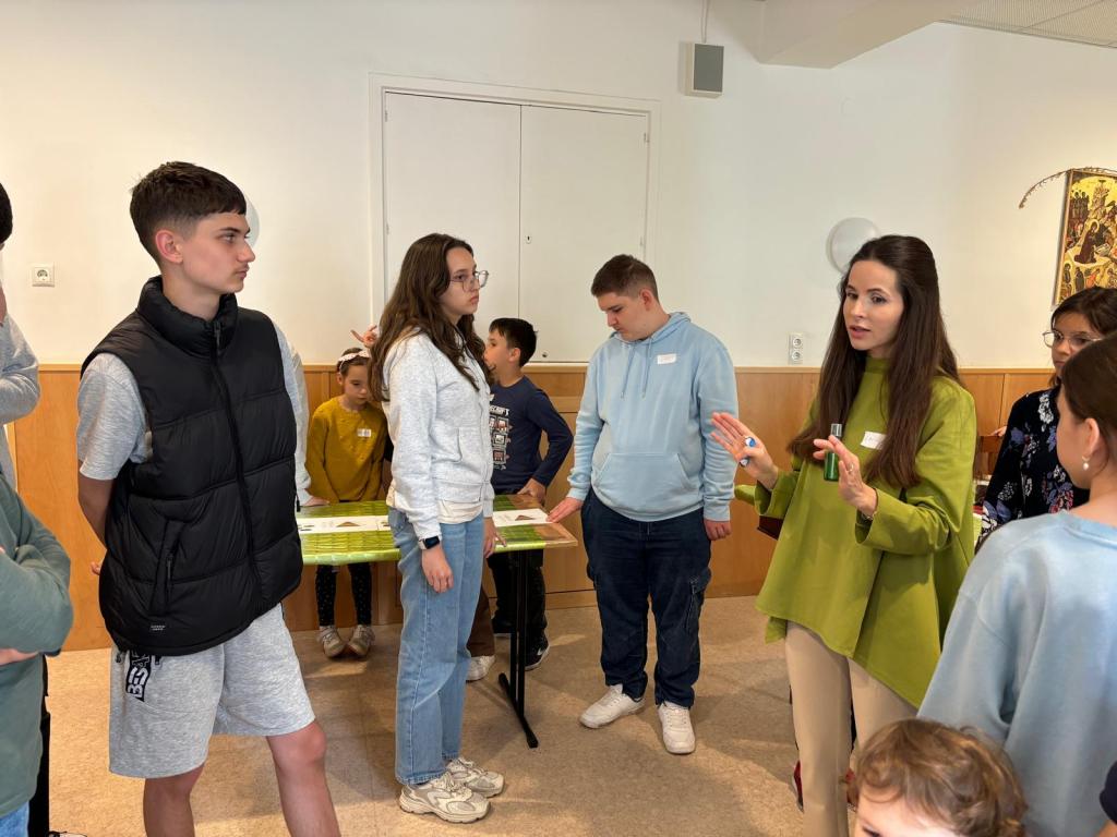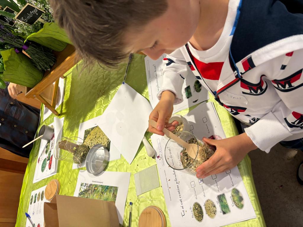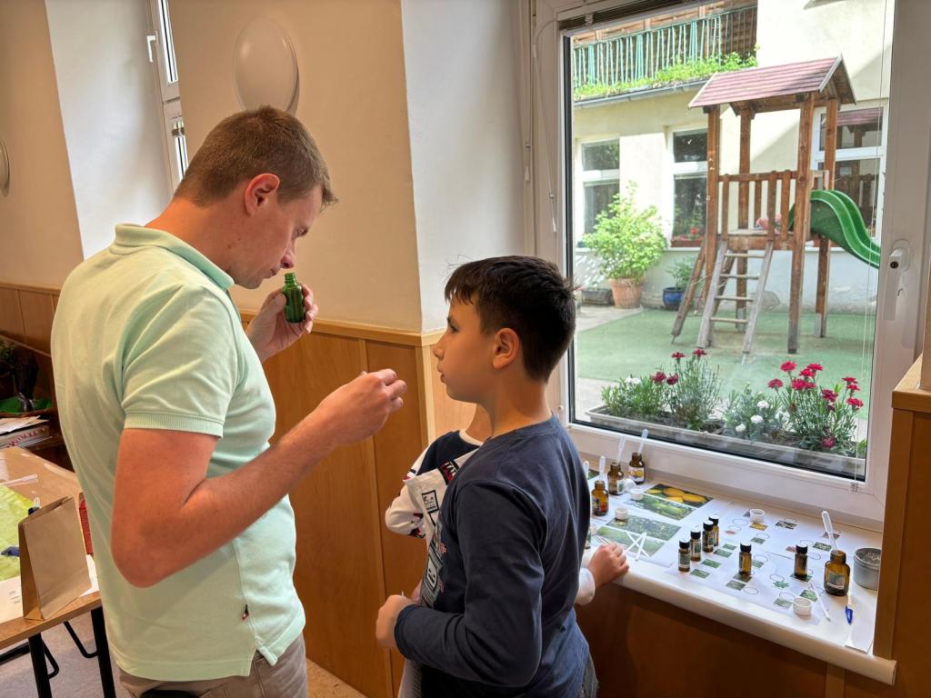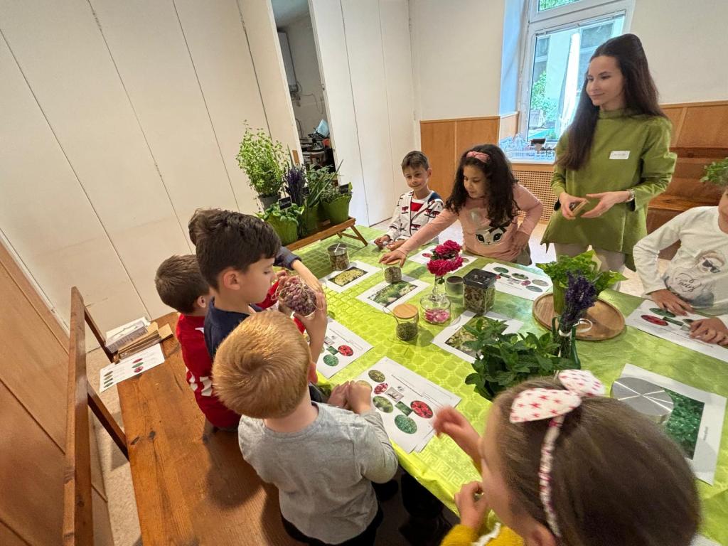 Partea practică a activității a fost o minunată experiență la nivel tactil și olfactiv, minuțios pregătită de dna farmacist Lavinia Albertino. Împărțiți pe grupe de vârstă, copiii au desfășurat două activități paralele: copiii mai mici au analizat forma, mirosul și textura diferitor plante aromatice și medicinale proaspete și uscate, iar apoi, urmând pașii descriși în fișa de activități, au creat propriile amestecuri de plante care, sub mojar și pistil, au devenit ceaiuri pentru membrii familiei. Nu au lipsit de la această grupă ghicitorile și cuvintele amestecate legate de minunata lume a plantelor. Concomitent, copiii mari au făcut cunoștință, la nivel olfactiv, cu uleiurile esențiale obținute din plante medicinale și aromatice. Din explicațiile doamnei farmacist, copiii au înțeles că uleiurile esențiale din gama prezentată (cedru, chiparos, gerariu, imortele, lavandă, mușețel, morcov, neroli, salvie, santal, tămâie), dincolo de plăcuta percepție olfactivă, au și multiple efecte terapeutice. Folosind formule de amestec de bază indicate pe fișele pregătite, copiii și-au creat apoi propriile produse: un roll-on ce se poate folosi în diferite afecțiuni ale pielii și un spray cu rol terapeuric, odorizant/dezodorizant.