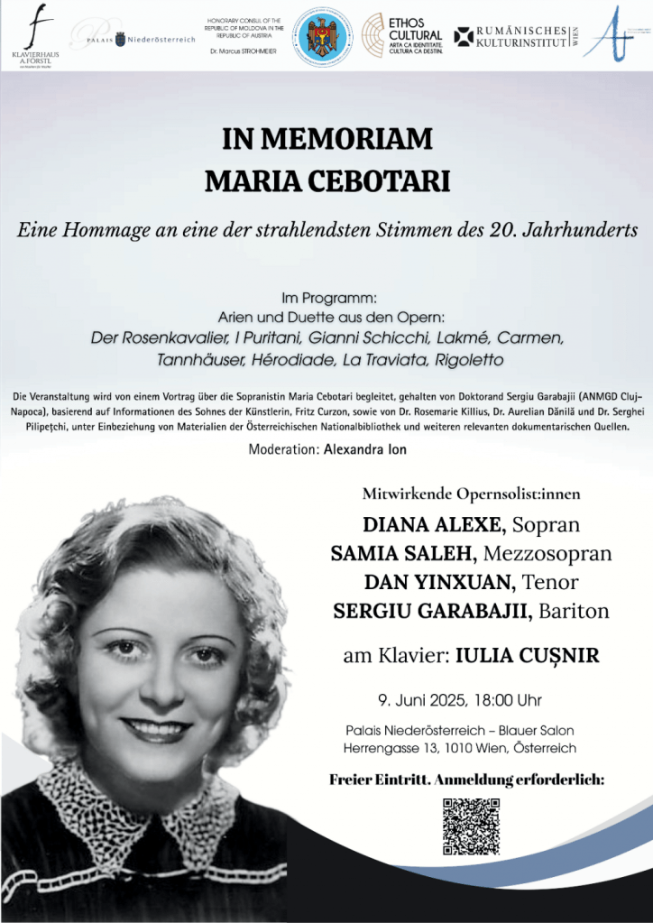Luni, 9 iunie, Ambasada Republicii Moldova în Austria, a organizat, alături de diferite instituții culturale, dar și în parteneriat cu Parohia Ortodoxă Română Sf. Antonie din Viena, un eveniment omagial dedicat renumitei Maria Cebotari (n. 1910 la Chișinău, +1949 la Viena), una dintre cele mai distinse voci ale secolului XX, care a marcat scena lirică internațională.