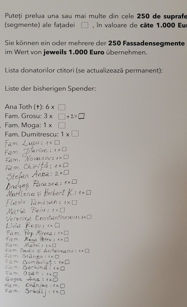 În mai puțin de 2 săptămâni multe familii de enoriași au contribuit deja cu câte un segment în valoare de 1000 de euro (din cele 250) care reprezintă contravaloarea renovării fațadei. La fiecare donație efectuată, numele donatorilor este trecut pe panoul din Biserică și o casetă este colorată cu auriu, pentru a vizualiza progresul donațiilor.