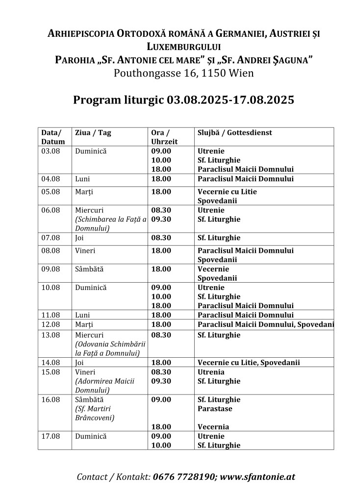 Sâmbătă, 23.08, 9.00: Sf. Liturghie, urmată de Parastase /// 18.00 Vecernie, urmată de cateheză