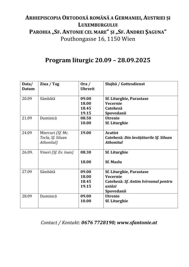 13.09, 9.00: Sf. Liturghie, Parastase (începând cu 6.09., la toate Sf. Liturghii de sâmbătă dimineața, cântarea la strană este asigurată de tineri și copii, adică de strana a 2a a bisericii noastre)