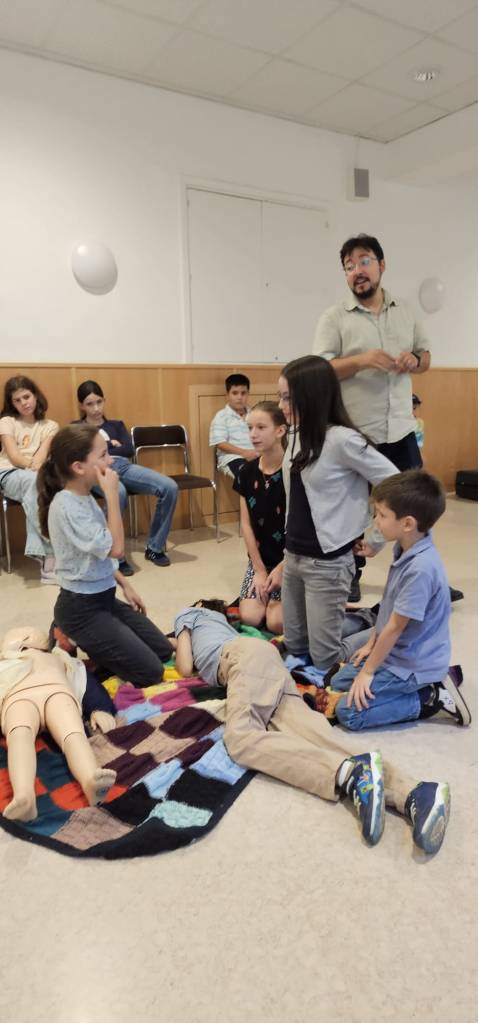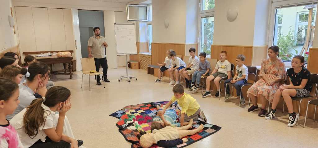 Dl. dr. Ion Alexandru Voropanov, medic specialist pediatru pneumolog de la spitalul Marius Nasta din București, cadru universitar al Universității de Medicină „Carol Davila”, dar și formator de prim ajutor cu multă experiență, a oferit copiilor o introducere practică, intensivă și foarte antrenantă în modalitățile de a acorda primul ajutor celor aflați în nevoie. Toți cei prezenți au învățat cu mult interes, dar și efort, elemente esențiale de resuscitare cardio-pulmonară, de exercitare a manevrei Heimlich și de acordare a primului ajutor în caz de traumatisme locale. Au fost abordate, de asemenea, teme esențiale precum: siguranța salvatorului, momentul oportun pentru a apela numărul unic de urgență 112 și informațiile care trebuie transmise, verificarea respirației, precum și poziția laterală de siguranță pentru victima inconștientă care respiră. Au fost discutate și situații particulare, cum ar fi electrocutarea sau căderea de la înălțime. În ceea ce privește elementele de prim-ajutor în caz de înec prin obstrucție cu corp străin, manevra Heimlich se aplică doar ca ultimă opțiune, după ce se încurajează tusea eficientă și, dacă aceasta nu rezolvă obstrucția, după efectuarea celor cinci lovituri interscapulare salvatoare.