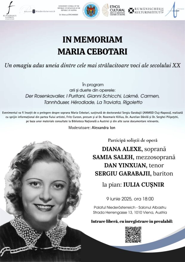 Luni, 9 iunie, Ambasada Republicii Moldova în Austria, a organizat, alături de diferite instituții culturale, dar și în parteneriat cu Parohia Ortodoxă Română Sf. Antonie din Viena, un eveniment omagial dedicat renumitei Maria Cebotari (n. 1910 la Chișinău, +1949 la Viena), una dintre cele mai distinse voci ale secolului XX, care a marcat scena lirică internațională.